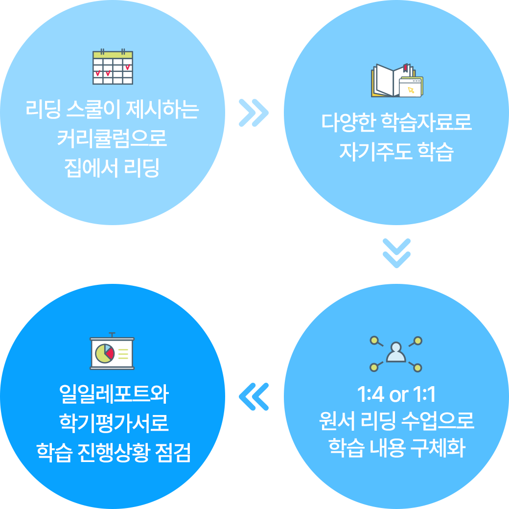 따로 학원에 다닐 필요 없이, 집에서 리딩하면서 같이 학습내용을 점검하면서 리딩 & 스피킹 아웃풋을 낼 수 있는 리딩 수업이 제공됩니다.